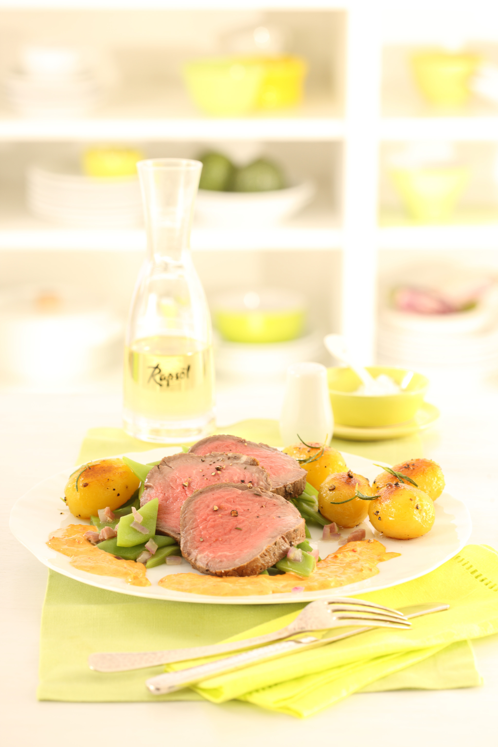 Rezeptidee März 2015: Rinderfilet mit Blitz-Hollandaise, Rosmarinkartoffeln und Bohnen