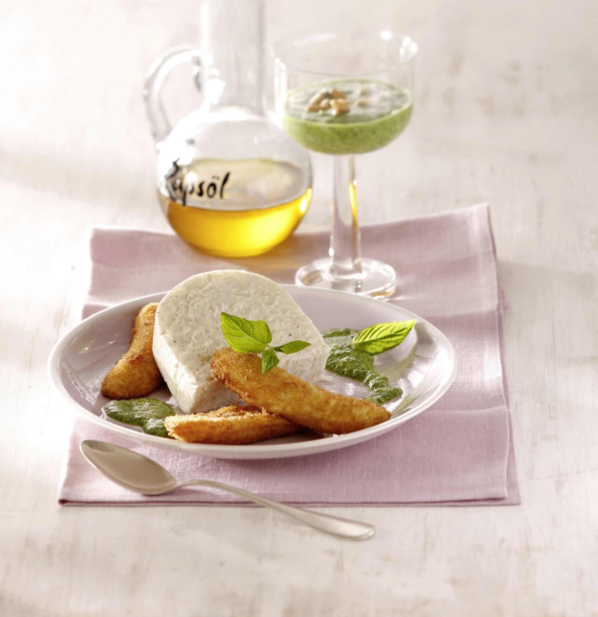 Rezeptidee Juni 2015: Milchreismousse mit gebackenen Bananen und Minz-Pesto
