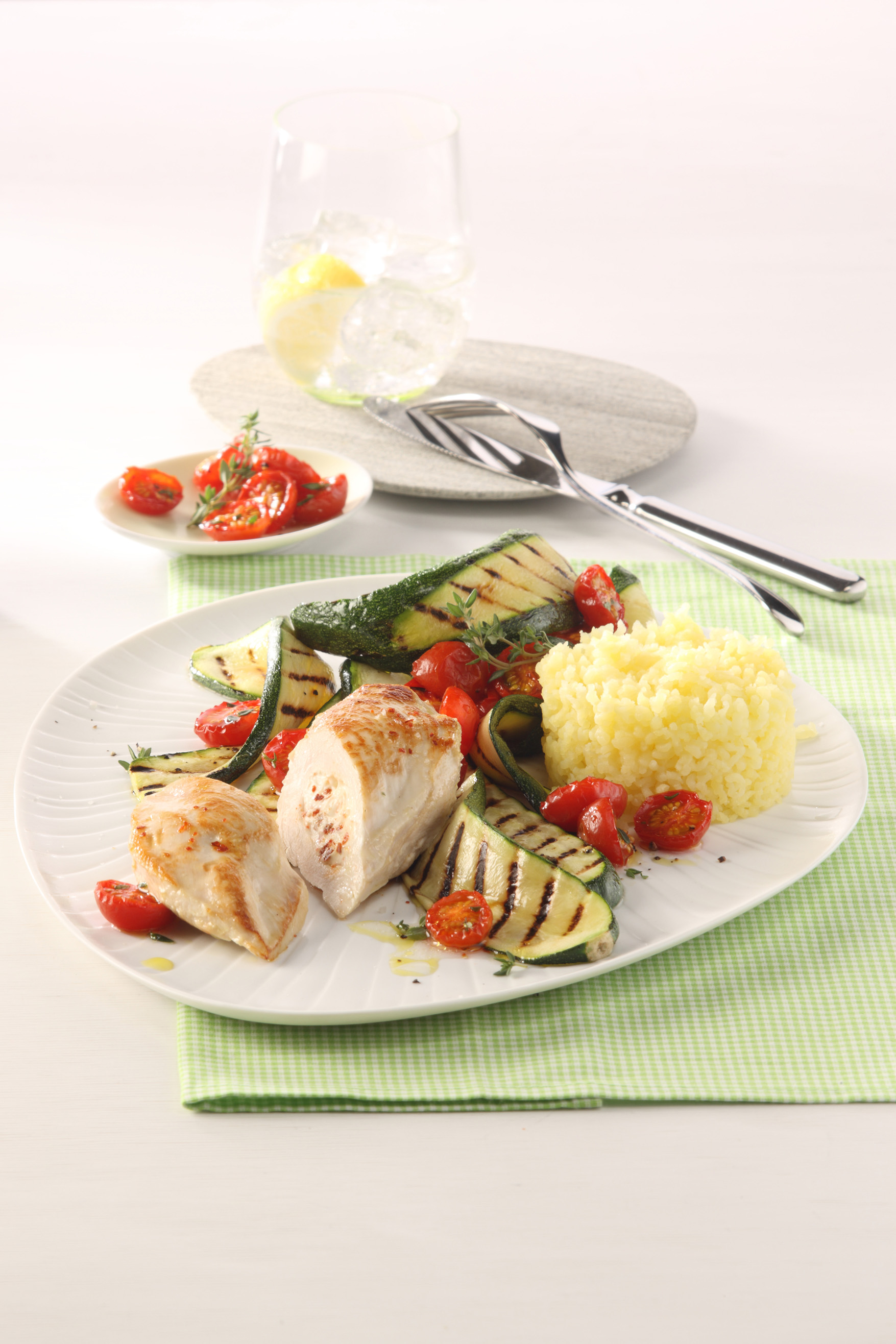 Das April-Rezept "Minutensteaks mit Grünspargel, Ofentomaten und Estragon-
