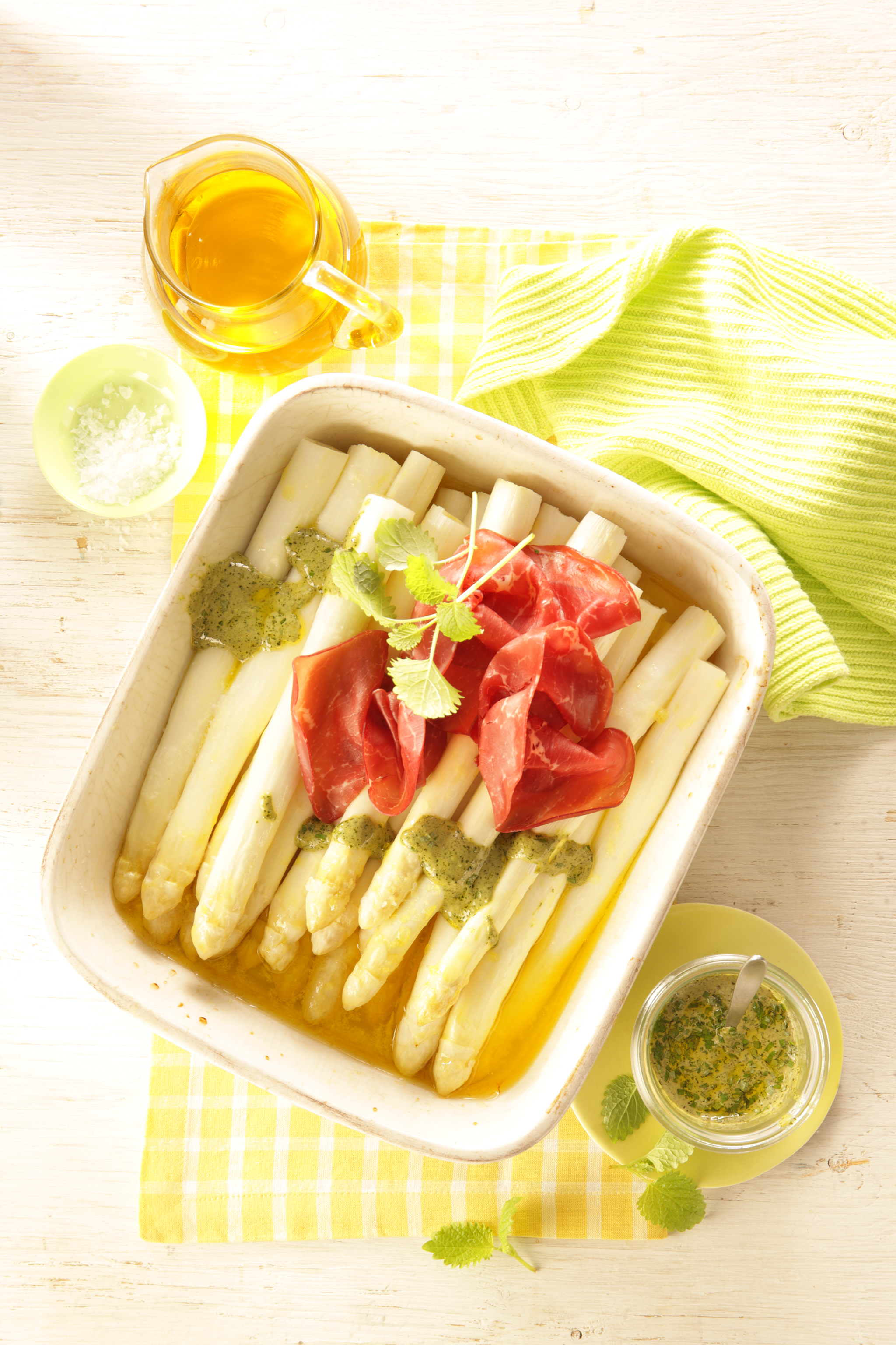 Rezeptidee April: Ofen-Spargel mit Zitronenmelisse-Pesto und Bresaola