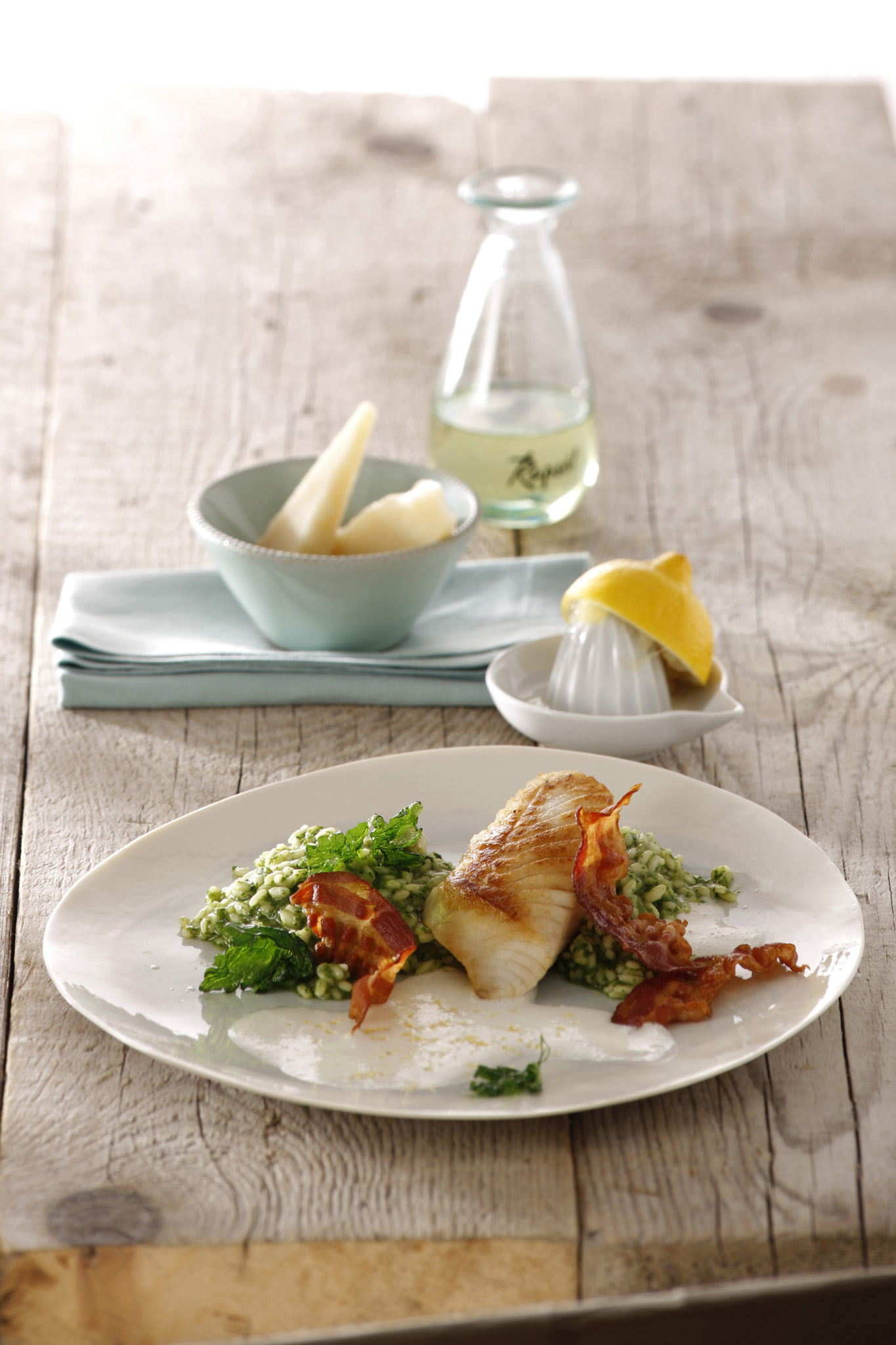 Rezeptidee Oktober 2016: Zanderfilet auf Petersilien-Risotto in weißer PetersiliensauceWurzelgemüse aus dem Ofen mit Minzpesto