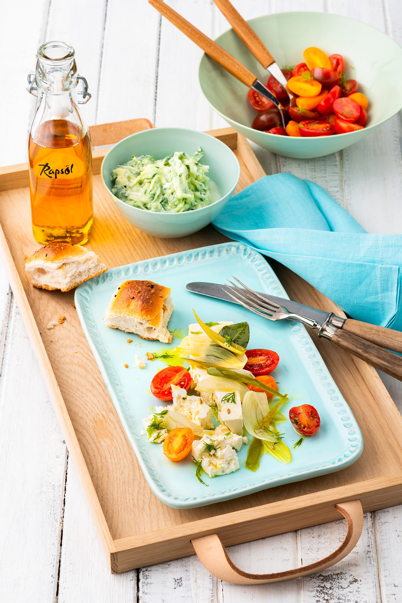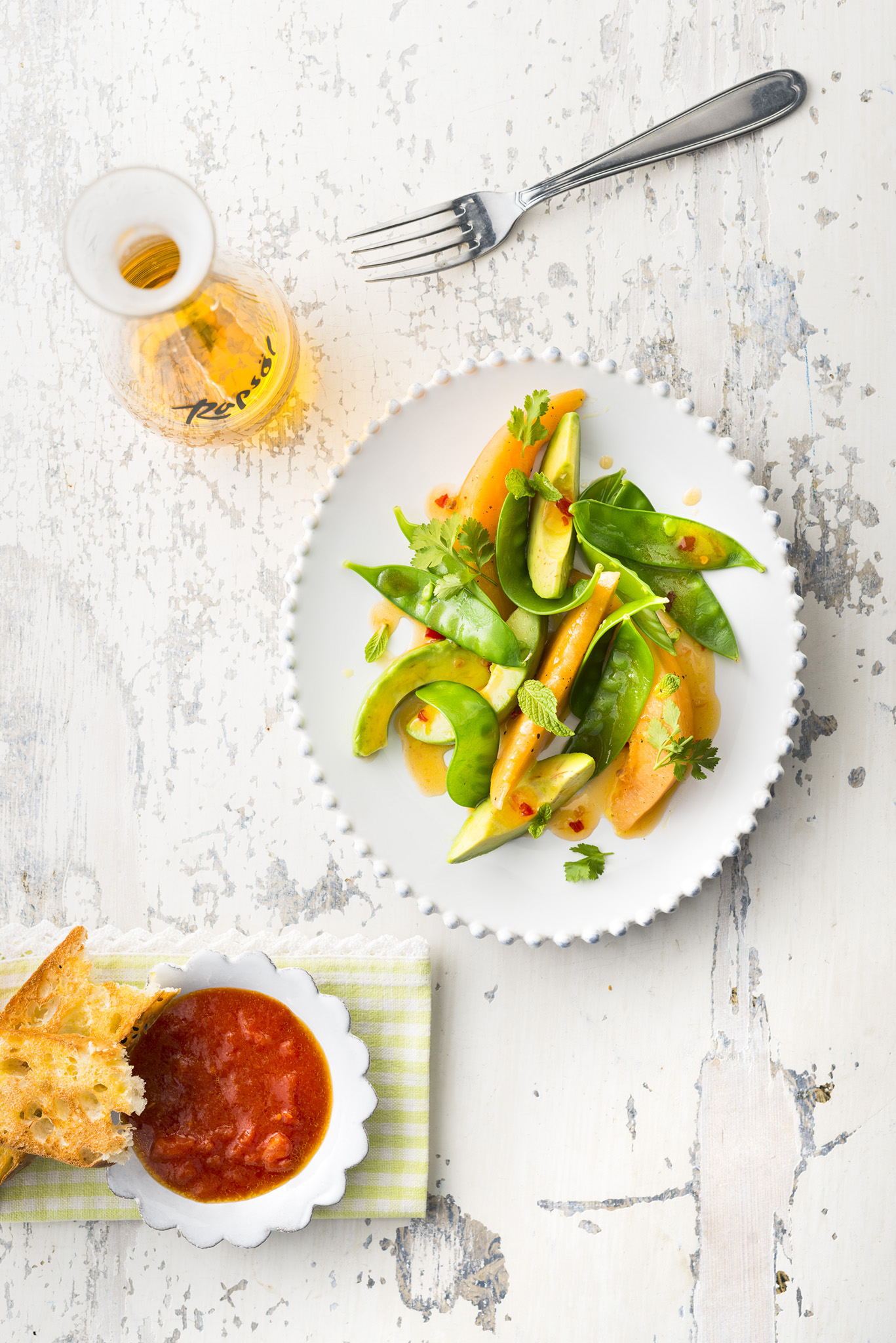 Rezeptidee Juli 2017: Sommersalat mit Melone, Avocado, Rapsöl-Vinaigrette und Tomaten-Safran Dip