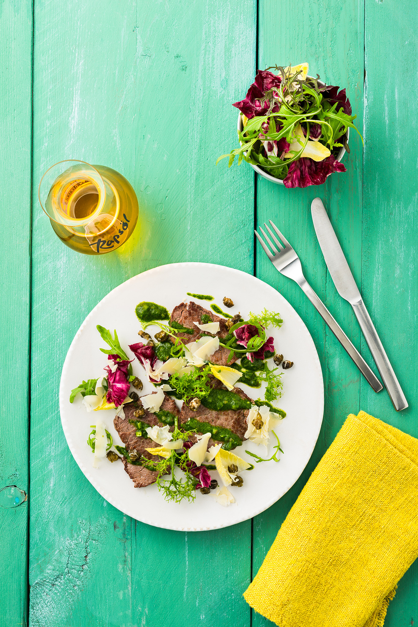 Rezeptidee Juni 2025: Minutensteaks mit grüner Salsa, Blattsalaten und frittierten Kapern