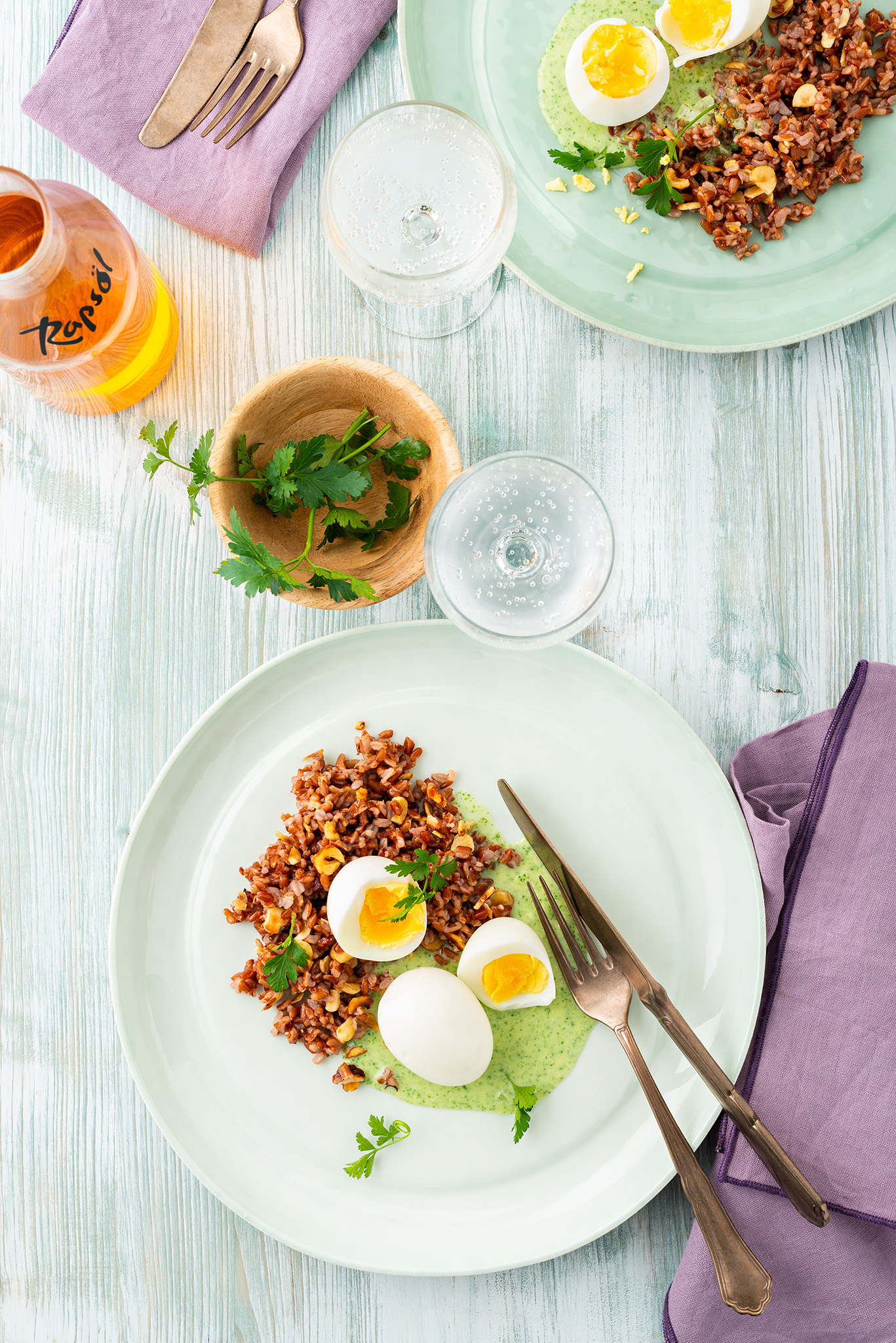 Rezeptidee März 2026: Eier in Kräutersauce mit rotem Nuss-Reis