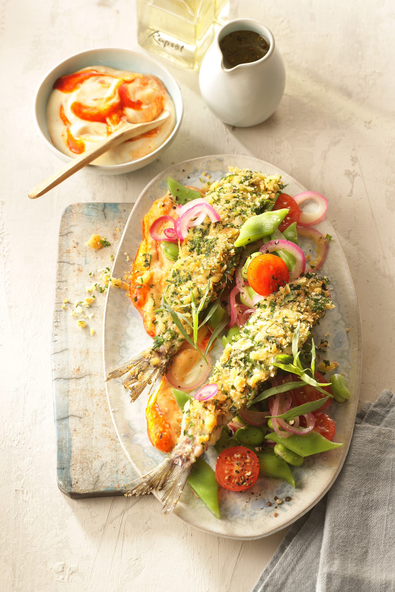 Rezeptidee Juni 2024: Matjesfilets in Kräuter-Pankokruste mit Sriracha-Mayonnaise auf lauwarmen Bohnensalat