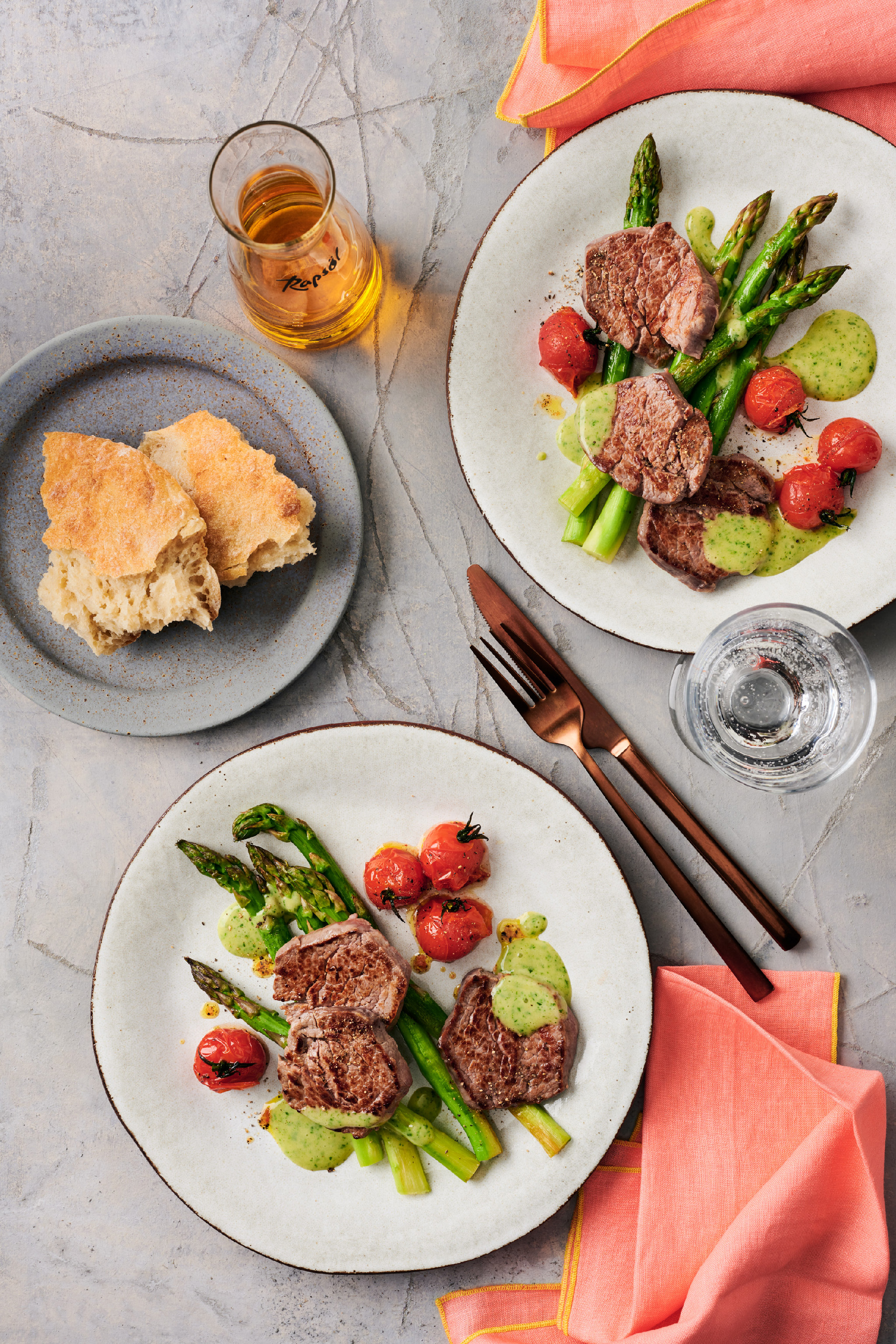 Rezeptidee April 2026: Minutensteaks mit Grünspargel, Ofentomaten und Estragon- Senf-Mayonnaise