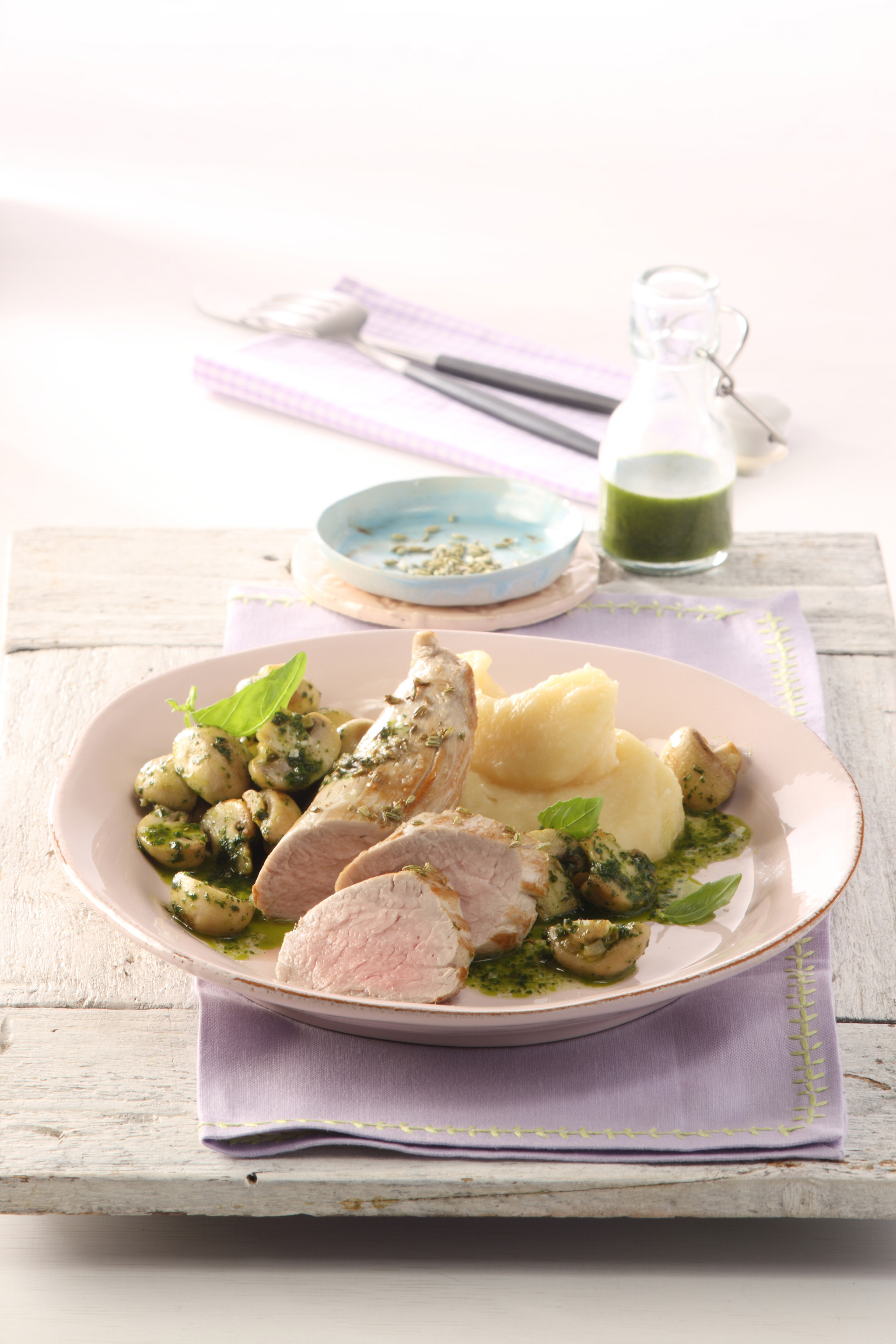 Rezeptidee Februar 2015: Schweinefilet mit Pastinakenpüree und Champignons in Basilikumöl