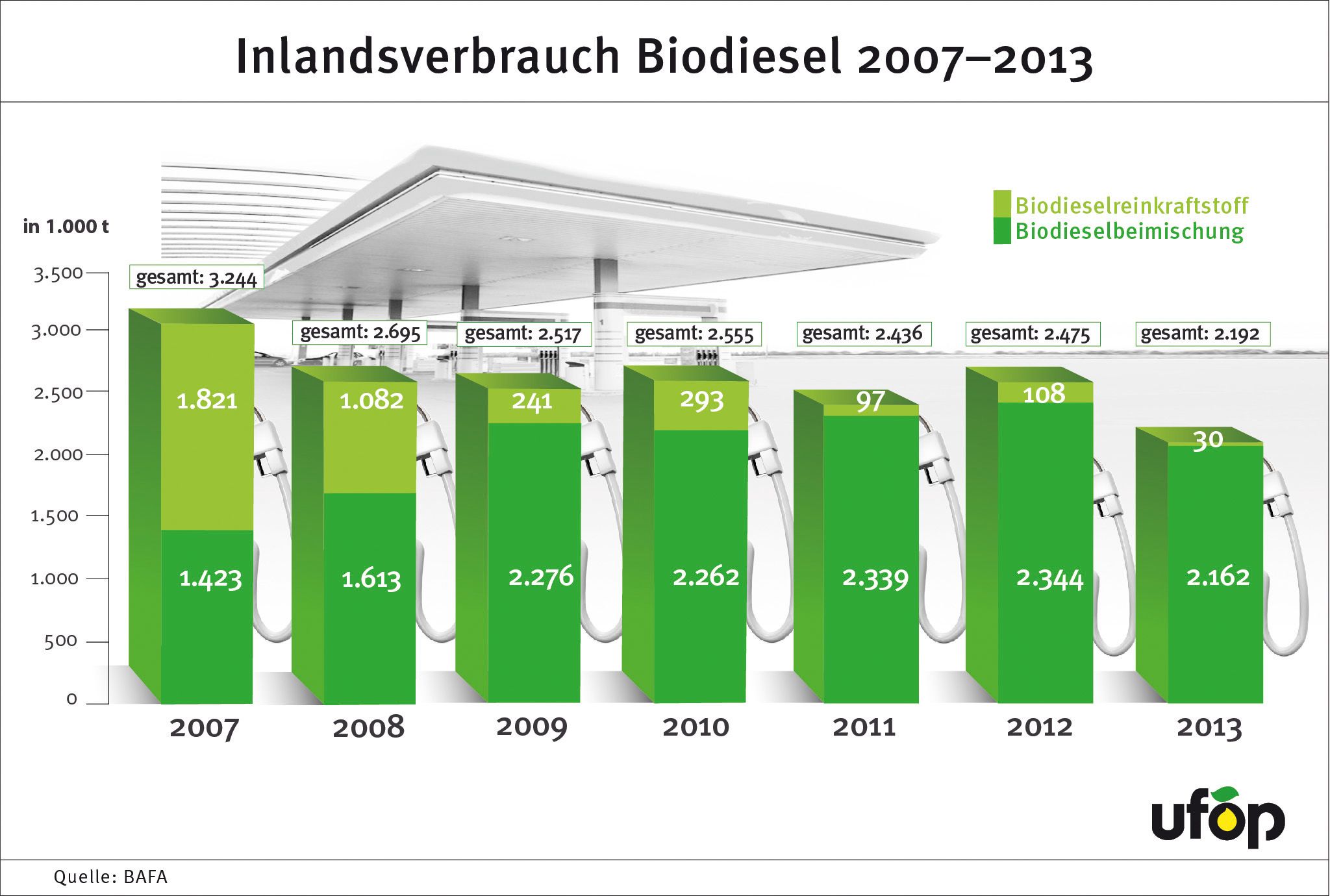Die Verbrauchstatistik verdeutlicht die Bedeutung der Reinkraftstoffvermarktung in den Jahren 2007 bis 2008 und die ab dem Jahr 2009 eingeführte energetische Gesamtquote von 5,25 Prozent und deren Anhebung auf 6,25 für den Zeitraum 2010 bis 2014. Der mit der Beschlussfassung des Biokraftstoffquotengesetzes politisch gewollte Mengenausgleich zur Kompensation der schrittweisen Reduzierung der Steuerbegünstigung – seit Januar 2013 wird Biodiesel voll besteuert – wird jedoch durch die Doppelanrechnung von Biokraftstoffen aus Abfallölen und durch HVO-Importe unterlaufen, kritisiert die UFOP.
