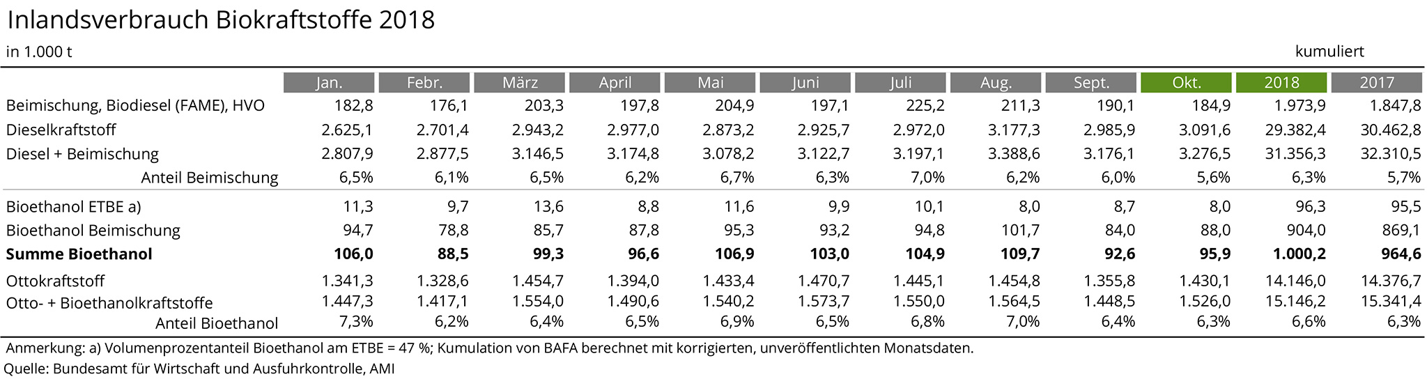 Treiber für die Beimischung von Biokraftstoffen ist die gesetzlich vorgegebene Treibhausgas-Minderungsverpflichtung und die damit verbundene Sanktionsregelung. Die THG-Quote stieg auf 4 Prozent für die Jahre 2017 bis 2019. Im Falle der Unterschreitung der Verpflichtung drohen den Unternehmen der Mineralölwirtschaft empfindliche Strafzahlungen von 460 EUR je t CO2. Die Angaben der BAFA schließen allerdings den Anteil an Hydrierten Pflanzenölen (HVO) ein. Diese Angaben sowie die Frage der Rohstoffanteile am Gesamtabsatz kann erst nach Auswertung der Nachhaltigkeitsnachweise durch die Bundesanstalt für Landwirtschaft und Ernährung (BLE) beantwortet werden.