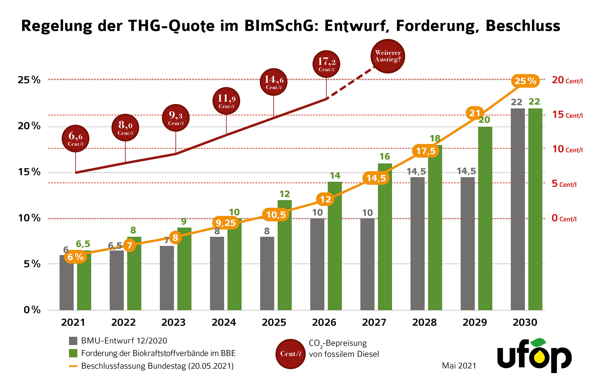 Berlin, 21.05.2021. Die Union zur Förderung von Oel- und Proteinpflanzen e. V. (UFOP) begrüßt, dass der Deutsche Bundestag eine Anhebung der Treibhausgas-Minderungsverpflichtung bei Kraftstoffen beschlossen hat. Das Gesetz sieht einen gleichmäßigen Anstieg von heute 6 % auf 7 % im Jahr 2022 und auf 25 % in 2030 vor. Die UFOP hatte wiederholt eine ambitioniertere THG-Quotenregelung gefordert. Ziel war es, der heimischen Landwirtschaft und der Biokraftstoffwirtschaft mittelfristig mehr Planungssicherheit zu ermöglichen und gleichzeitig neuen Optionen wie Biokraftstoffen aus Reststoffen, synthetischen Kraftstoffen sowie Wasserstoff durch einen technologieoffenen Ansatz Chancen für den Markteintritt einzuräumen.