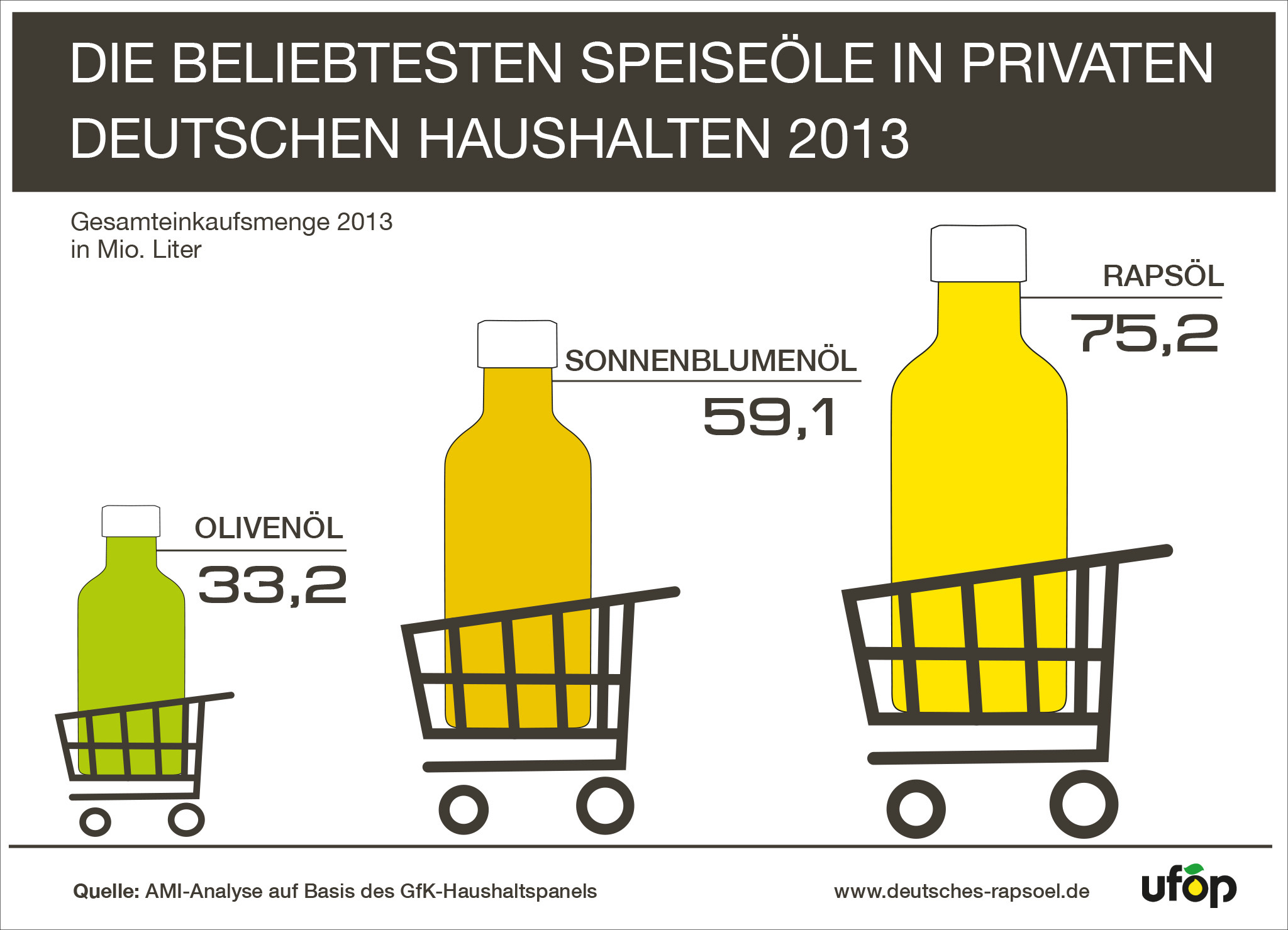 Bereits 2009 hat Rapsöl es an die Spitze der beliebtesten Speiseöle geschafft. Und es festigt seine Position von Jahr zu Jahr mit weiteren Absatzsteigerungen. Sein Marktanteil lag 2013 bei 39 Prozent*. Kein anderes Speiseöl fand seinen Weg öfter in die Einkaufswagen der deutschen Verbraucher. Jeder Haushalt hat im Durchschnitt 1,8 Liter Rapsöl konsumiert. 75,2 Mio. Liter waren es insgesamt im vergangenen Jahr. An zweiter Stelle liegt Sonnenblumenöl mit 59,1 Mio. Litern, dahinter folgt Olivenöl mit 33,2 Mio. Litern. Insgesamt haben die Deutschen 192,2 Mio. Liter Speiseöl im Jahr 2013 eingekauft.
