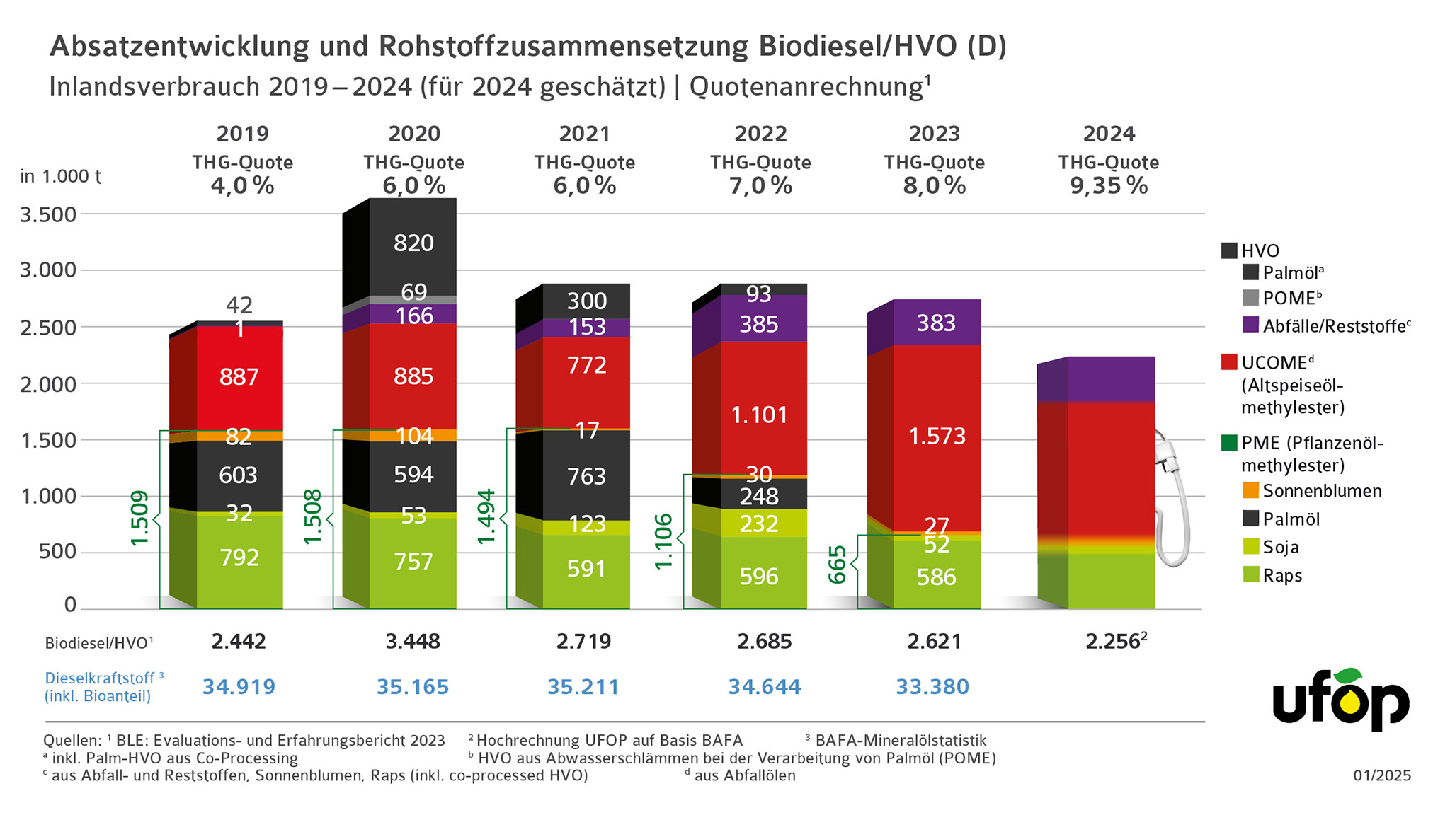 Treiber dieses Verdrängungs- und Verlagerungseffektes seien die THG-Minderungseffizienz und – im Falle bestimmter Abfallöle – vor allem die wirtschaftlich interessante doppelte Anrechnung auf die THG-Minderungsverpflichtung. Als Folge dieser Regelung seien Verlagerungseffekte, nicht nachvollziehbare Abfalldefinitionen und ein Preisverfall bei THG-Quoten auf zeitweise unter 100 EUR je t CO2 festzuhalten, stellt die Förderunion fest. Die grundsätzlich hohe Attraktivität der Förderkulisse im deutschen THG-Quotenmarkt führe zu spürbaren Effekten bei der Rohstoffzusammensetzung von Biodiesel bzw. HVO. 2023 konnten hierzulande Biokraftstoffe aus Palmöl erstmals nicht mehr auf die THG-Minderungsverpflichtung angerechnet werden. Infolge der besseren THG-Effizienz und rohstoffabhängigen Möglichkeit der Doppelanrechnung ersetzten 1,573 Mio. t Biodiesel und 0.383 Mio. t HVO aus Abfallölen die Biokraftstoffmengen aus Palmöl und zum Teil auch aus Rapsöl, so der Bericht der BLE. Für das Quotenjahr 2024 erwartet die UFOP eine Verstärkung dieses Effektes. Auf Basis der Angaben des Bundesamtes für Wirtschaft und Ausfuhrkontrolle (BAFA) für die in den Monaten Januar bis November 2024 in Verkehr gebrachten Biodiesel- bzw. HVO-Mengen schätzt die UFOP für das Quotenjahr 2024 eine nochmalige Verringerung der verbrauchten Menge auf 2,256 Mio. t. Bemerkenswert sei, dass der Bedarf im Dieselmarkt trotz der gegenüber 2023 von 8,0 % auf 9,35 % gestiegenen THG-Minderungsverpflichtung um 365.000 t sinke, betont die UFOP.