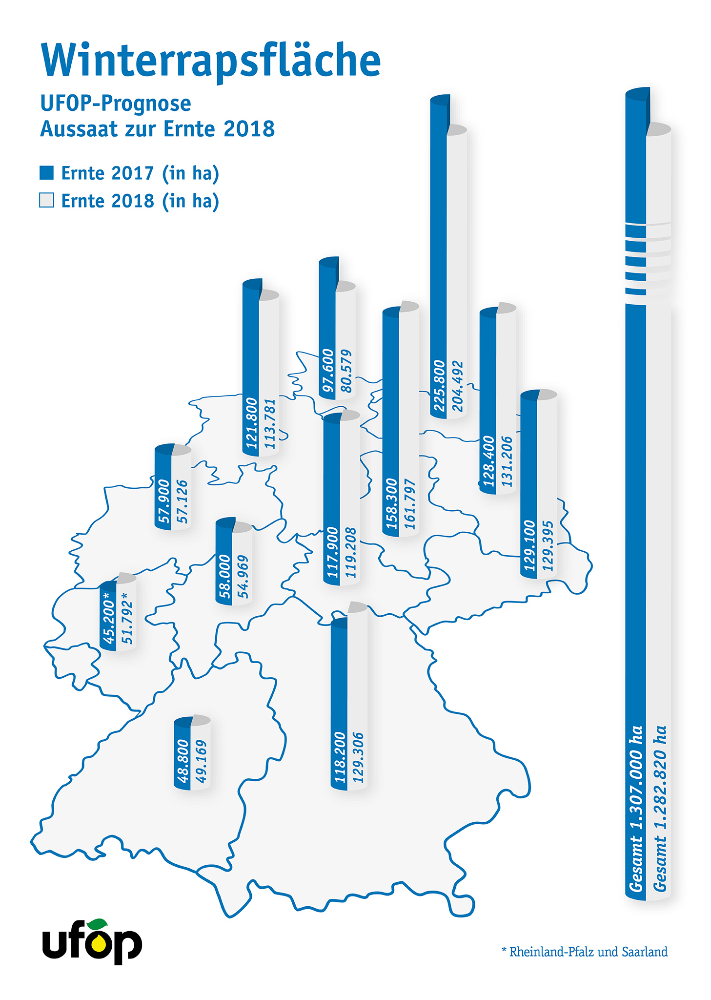 Das von der Union zur Förderung von Oel- und Proteinpflanzen e. V. (UFOP) beauftragte Agrarmarktforschungsinstitut Kleffmann Group schätzt die Aussaatfläche von Winterraps zur Ernte 2018 auf 1,283 Millionen Hektar. Basis dieser Flächenschätzung ist eine Befragung von ca. 1.400 Raps-Landwirten, die im September/Oktober deutschlandweit durchgeführt wurde. Im Vergleich zur Erntefläche 2017 bedeutet dies einen Rückgang des Anbaus um rund 24.000 Hektar bzw. 1,9 Prozent. Bis zum Ende der Befragung mussten aufgrund ungünstiger Witterung bereits ca. 3.900 Hektar umgebrochen werden, sodass aktuell von einer Anbaufläche von rund 1,279 Millionen Hektar auszugehen ist.