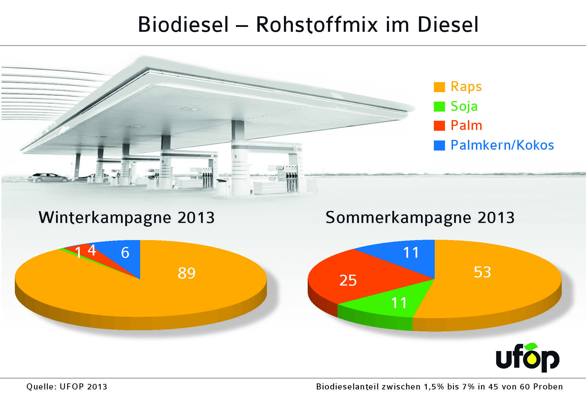 Analog zur UFOP-Studie im Sommer 2013 wurden Ende November 2013 deutschlandweit 60 Tankstellen von Mineralölunternehmen beprobt. Dabei wurde der Biodieselanteil im Dieselkraftstoff, dessen Rohstoffzusammensetzung und der Anteil an hydriertem Pflanzenöl (HVO) bestimmt. Gegenüber der ersten Untersuchung hat der Anteil Dieselkraftstoffproben ohne Biodiesel von 20 auf 25 Prozent und damit der Einsatz von HVO zugenommen. Im Gegensatz zu Biodiesel können hydrierte Pflanzenöle bei der Herstellung chemisch an die Anforderungen der Winterqualität angepasst werden. Durch die Analysemethode kann aber keine unmittelbare Schlussfolgerung auf die Rohstoffzusammensetzung des HVO-Anteils getroffen werden.